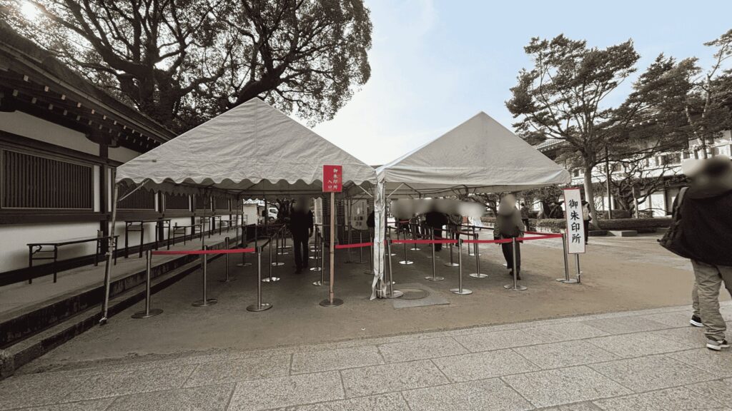 正月期間は特別に楼門外(仮殿向かって左手の門外)に特設御朱印所が設置されます。時間帯によっては楼門内の御朱印所でも対応してもらえます。御朱印はその場で揮毫してもらえるので、直接御朱印所を訪れてください。