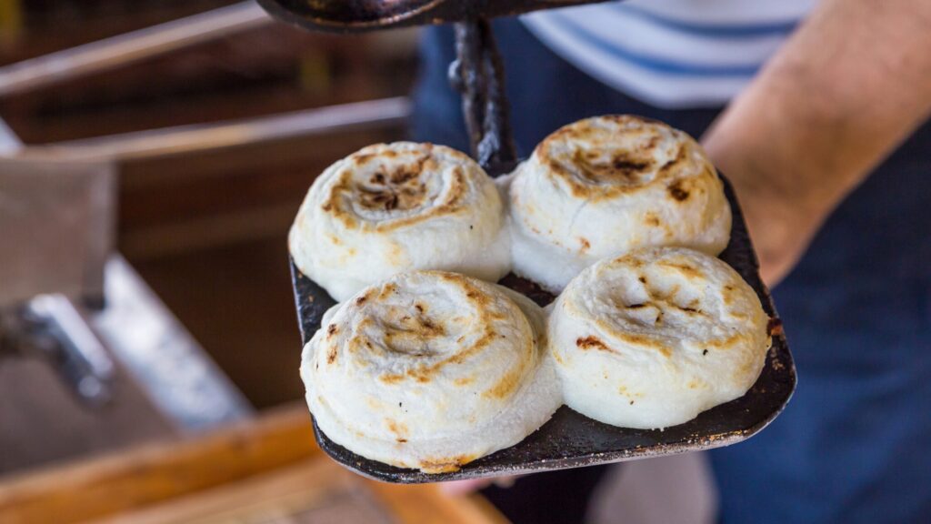 参道の梅ヶ枝餅店は元日の早朝から営業しており、焼きたてを頬張りながら初詣に向かうのもおすすめです。寒い中、焼きたての梅ヶ枝餅とほくほくの餡子が体を温めてくれます。